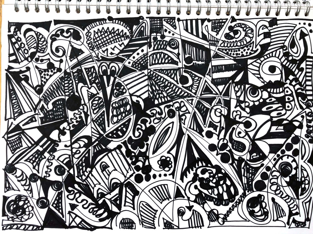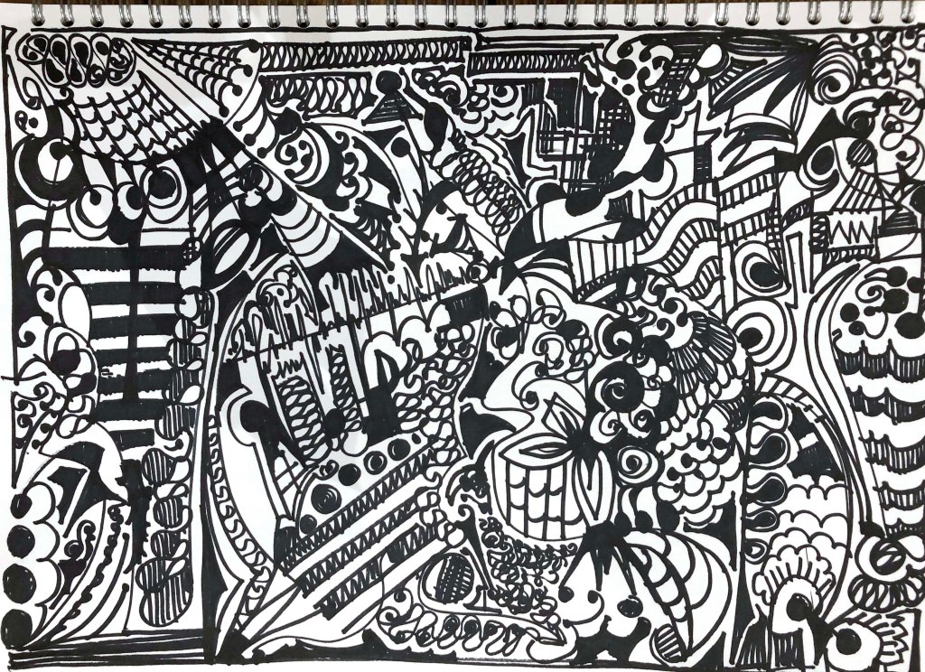 Many people think that doodling is something you do when you are daydreaming but I have discovered that studies have been done to suggest that doodling can be something that helps memory and concentration and that doodling occupies a space somewhere between awareness and daydreaming. (Professor Jackie Andrade, University of Plymouth) I certainly found that I could sit and concentrate much better if I was letting my black sharpie pen do its thing.
